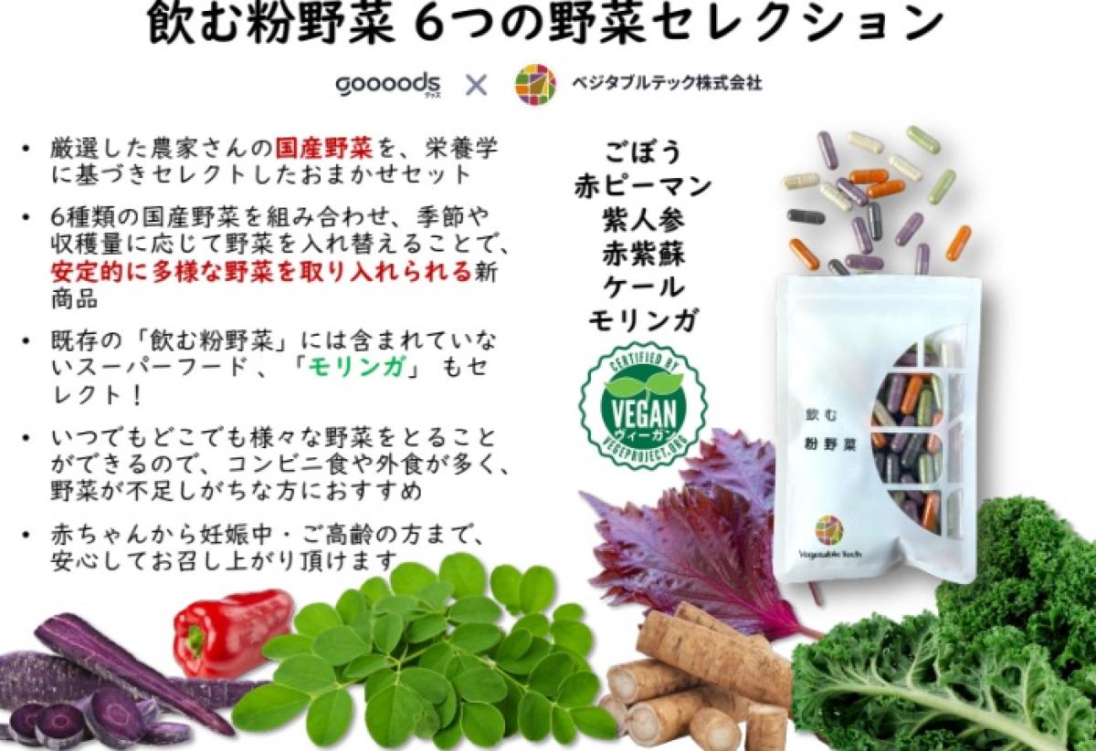 「飲む粉野菜〈6つの野菜セレクション〉」は、6種類の国産野菜を組み合わせ、季節や収穫量に応じて使用する野菜を入れ替えることで、安定的に多様な野菜を摂取できる商品です。話題のスーパーフード「モリンガ」も配合しています。本商品は、goooods限定でのお取り扱いとなります。